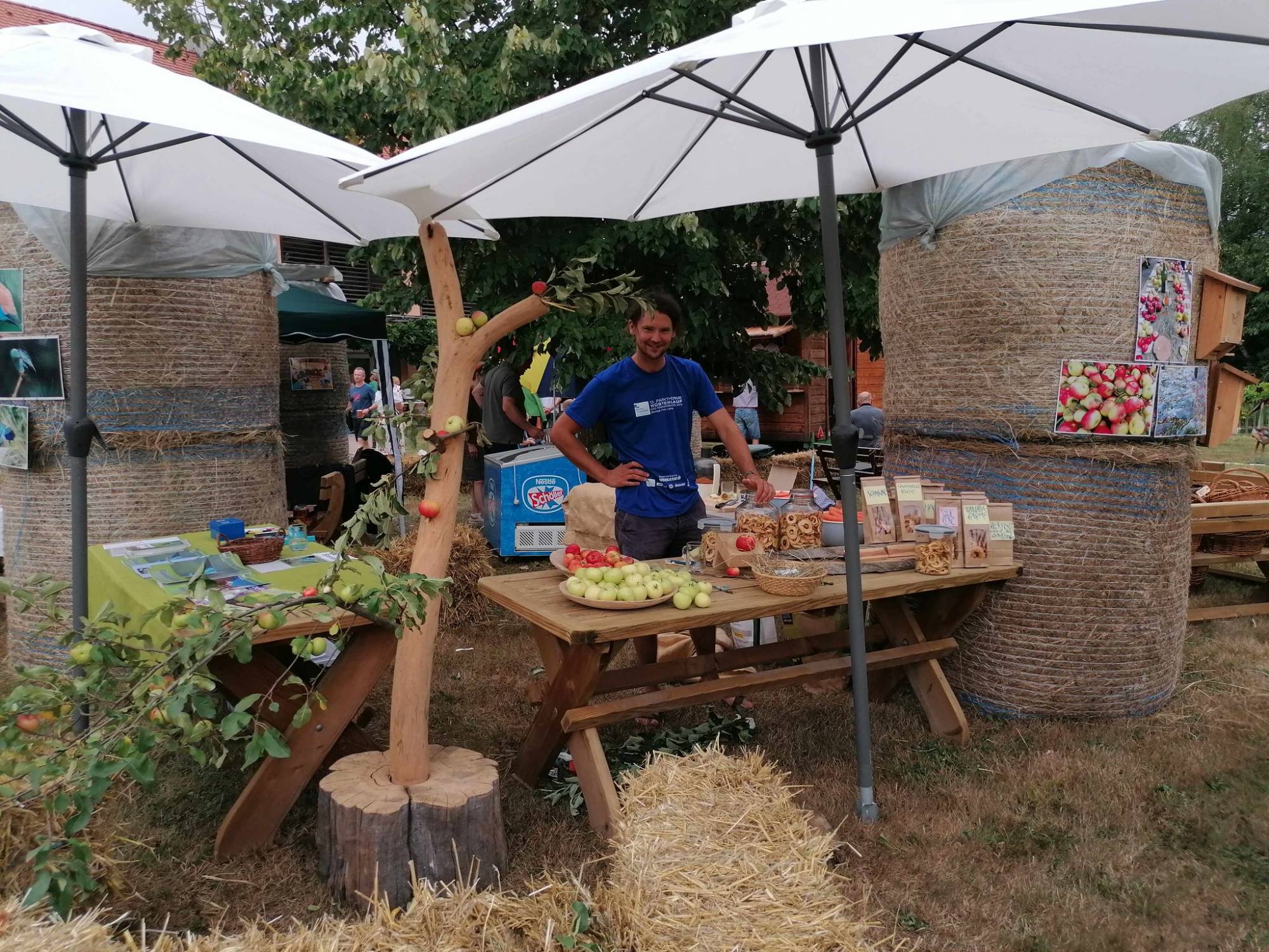 Schon sehr früh haben uns diesmal unsere Gäste besucht und sie haben auch einiges zu sehen bekommen. Handwerkskunst unserer Korbflechter Leopold Riedrich und Josef Dorner und vom Schmied Max Ritter, Sensen dengeln mit Franz Lex, seltene Haustierrassen mit den Steirischen Scheckenziegen von Gerhard Feldgitscher und Ponyreiten für die Kleinen mit der Familie Hackl. Außerdem haben sich unsere Damen vom Infostand wieder alle Mühe gegeben. Heuer gab es erstmals ein Blaurackenleibchen für Mann und Frau und Kind zu kaufen. Entworfen hat es Kathi Putz unsere ehrenamtliche Mitarbeiterin aus Graz/Dirnbach. Kuchen gab es von unseren Sängerinnen und Freunden gesponsert. Unseren Streuobststand betreuten unsere beiden Mitarbeiter Curd Ranz und Stefan Tschiggerl.