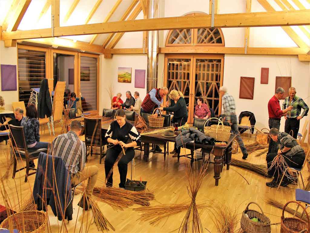 Jeweils am Freitag nach dem Festtag der Hl. Drei Könige treffen sich die Stainzer Korbflechter im Haus der Vulkane und freuen sich nach der langen Sommerpause über das Wiedersehen. „Weiden putzen und herrichten für das Flechten des Korbbodens sind die ersten Griffe, die Korbflechter lernen müssen“, so Leopold Riedrich, einer der Lehrmeister. Es schaut kompliziert aus, wenn für das Bodenkreuz die Weiden gespaltet und zusammen geschoben werden. Mit dünnen Weiden beginnt dann das Flechten. „Ganz so schwer kann es nicht sein, wenn mein 12-jähriger Sohn Florian es innerhalb weniger Tage erlernt hat“, macht Christian Lackner aus Radochen den Anfängerinnen Mut. Und stolz zeigen diese am Ende des ersten Abends ihren fertigen Boden und freuen sich schon, wenn sie beim nächsten Mal die Weiden für den Aufbau der Seitenwand in diesen einstecken werden.