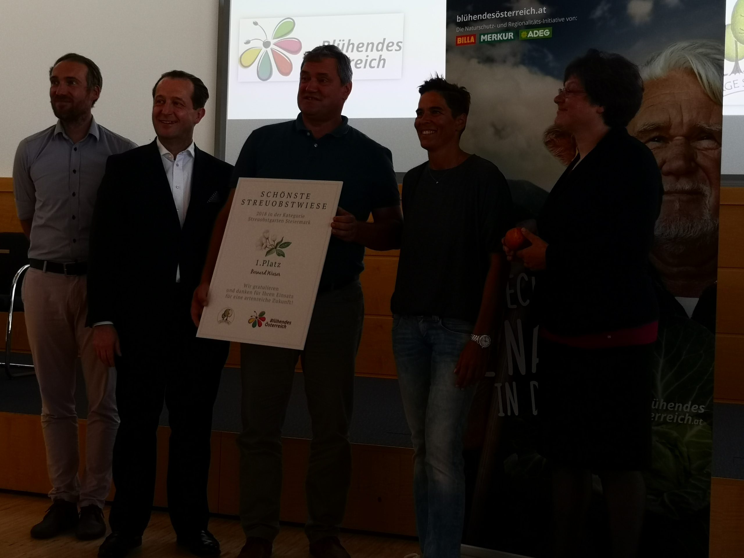 Die Verleihung fand in Wiener Neudorf im REWE Zentrum statt. Der REWE Konzern unterstützt die Aktion Blühendes Österreich mit 1 Cent je verkauftes Regionalprodukt. Dieses Geld fließt in Naturschutzaktivitäten ein. Eine eigene Streuobstschiene wurde aufgebaut. Mit dem Verband ARGE Streuobst hat man einen guten Partner gefunden. Mag. Bernard Wieser konnte den Preis von der Juri, der auch Michi Dorfmeister und Billa-Vorstand Robert Nagele angehören, entgegennehmen.