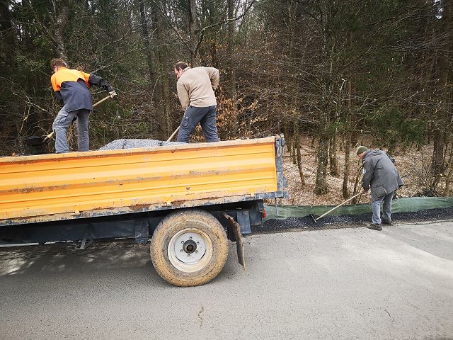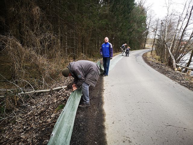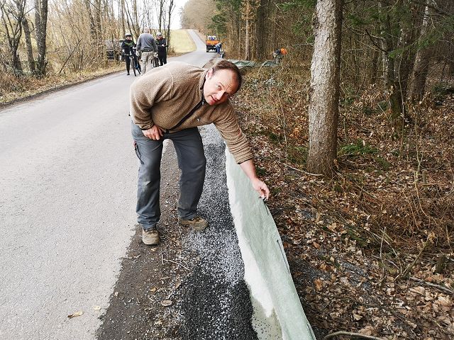 Am Waldrand und im Straßenbankett zu arbeiten ist besonders anstrengend. Jede Kübelfalle muss erst mühsam eingegraben werden und nur mit Split kann man die Zäune abdichten.