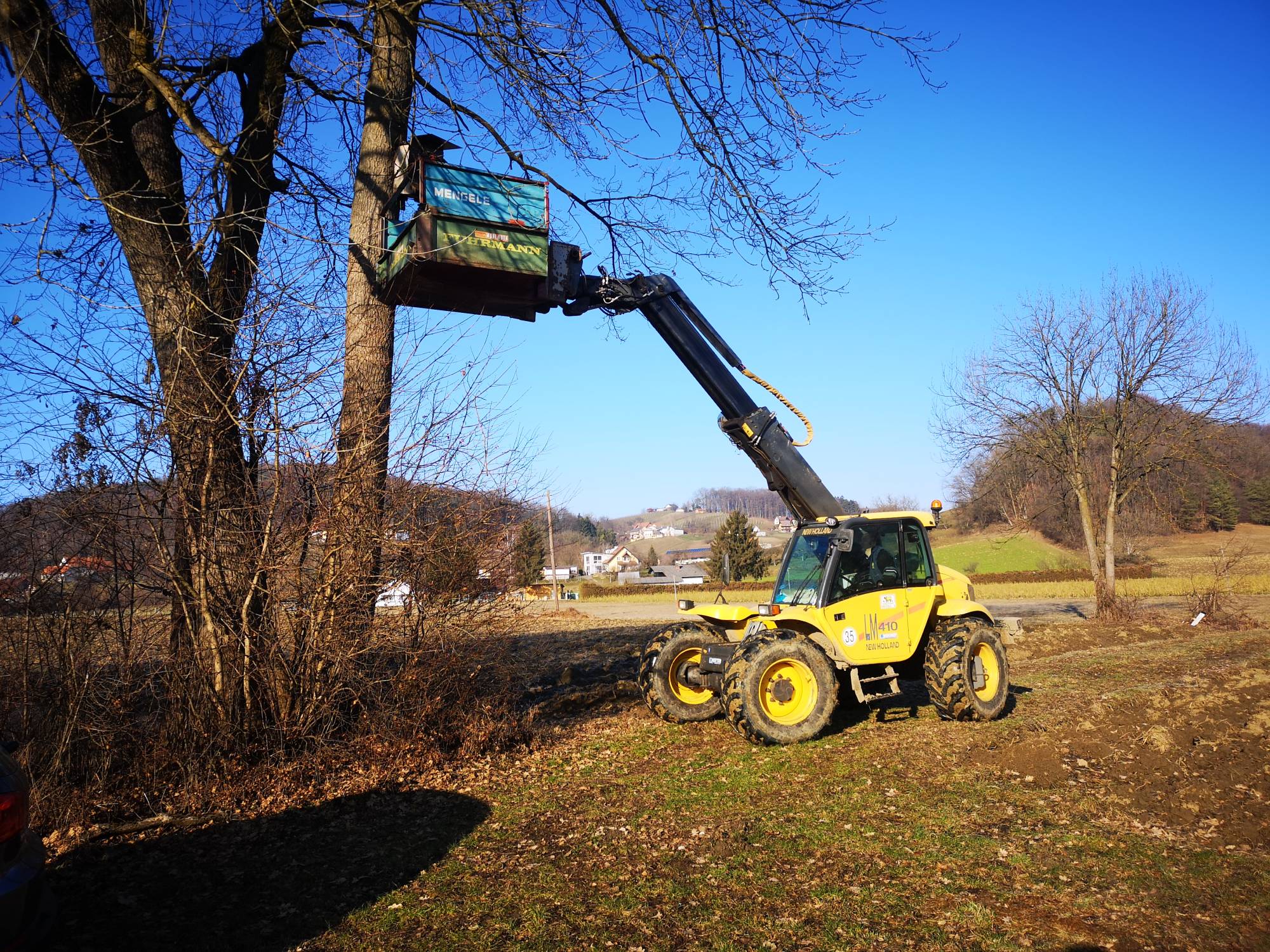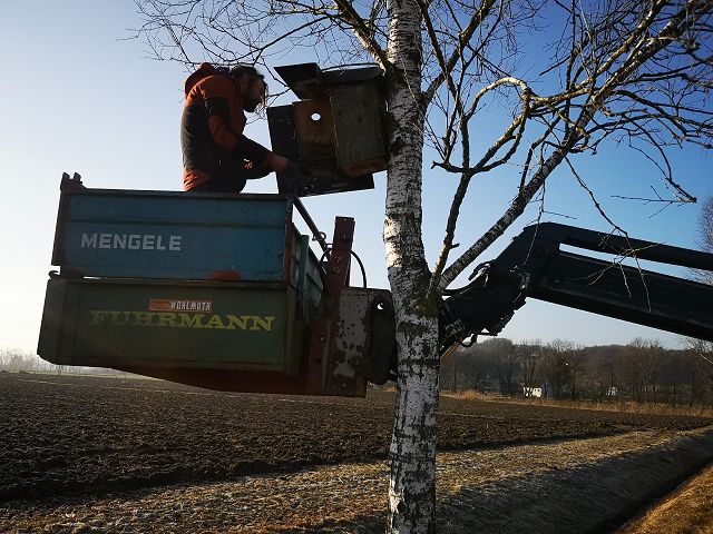 Hans Kaufmann unterstützt diese Aktion seit der Gründung des Blaurackenvereines ehrenamtlich jährlich mehrere Tage mit seinem Lader, der uns als Lift zu den 5-6 Meter hoch hängenden Nistkästen bringt. Gefahren werden kann nur bei starkem Frost über die gefrorene Böden, damit dort kein Schaden entsteht.