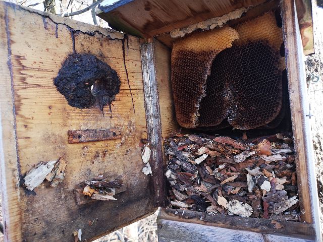 Vom Kleiber übernommener Nistkasten durch Honigbienen