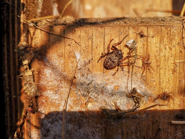Diadem-Kreuzspinne überlebt den Winter im Nistkasten. Daneben andere Spinnenarten