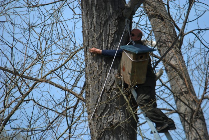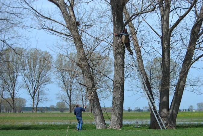 Hoch in den Pappelstämmen wird der Brutkasten befestigt
