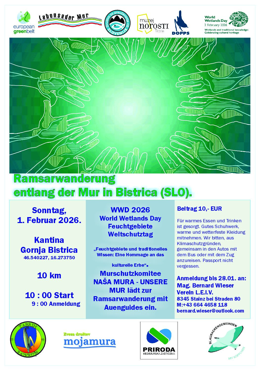 Zum Tag der Feuchtgebiete gibt es wieder eine Wanderung entlang der Mur. diesmal im Slowenischen Gornja Bistrica. Treffpunkt ist die Kantine bei der Murbrücke. Teilnehmer aus Österreich melden sich bitte bei Mag. Bernard Wieser (Sprecher des Österreichischen Murschutzkomitees) – siehe Einladung – an. Mitfahrgelegenheit mit einem Bus ab Mühldorf bei Feldbach – Sparmarkt. Abfahrt um 08 Uhr. Anmeldung in Gornja Bistrica ab 09 Uhr. Abmarsch um 10 Uhr. Für Essen, Trinken und die WWD-Plakette 2026 werden € 10,- eingesammelt. Die Buskosten richten sich nach der Zahl der Mitreisenden.