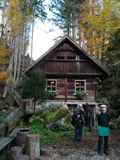 Das Wetter ist uns an diesem Tag holt und führt uns in die Flusslandschaft der Weißen Sulm und durch den Ort Wielfresen. Holzkreuze auf den Türen der Wirtschaftsräume zeugen von einem jährlich wiederkehrenden Brauch, des Segnens des eigenen Tuns. Kapellen und Wegkreuze säumen unseren Weg zur Strutz-Mühle.