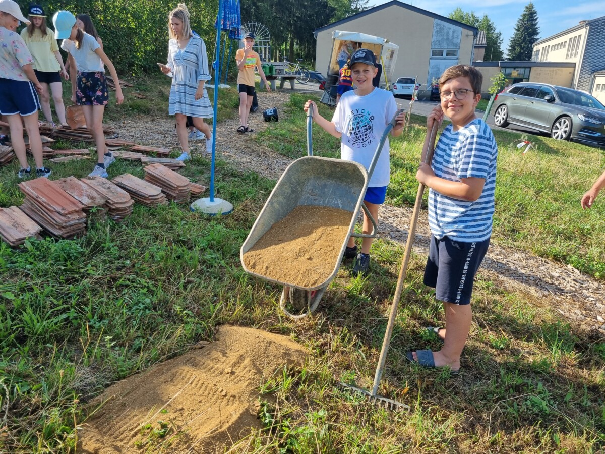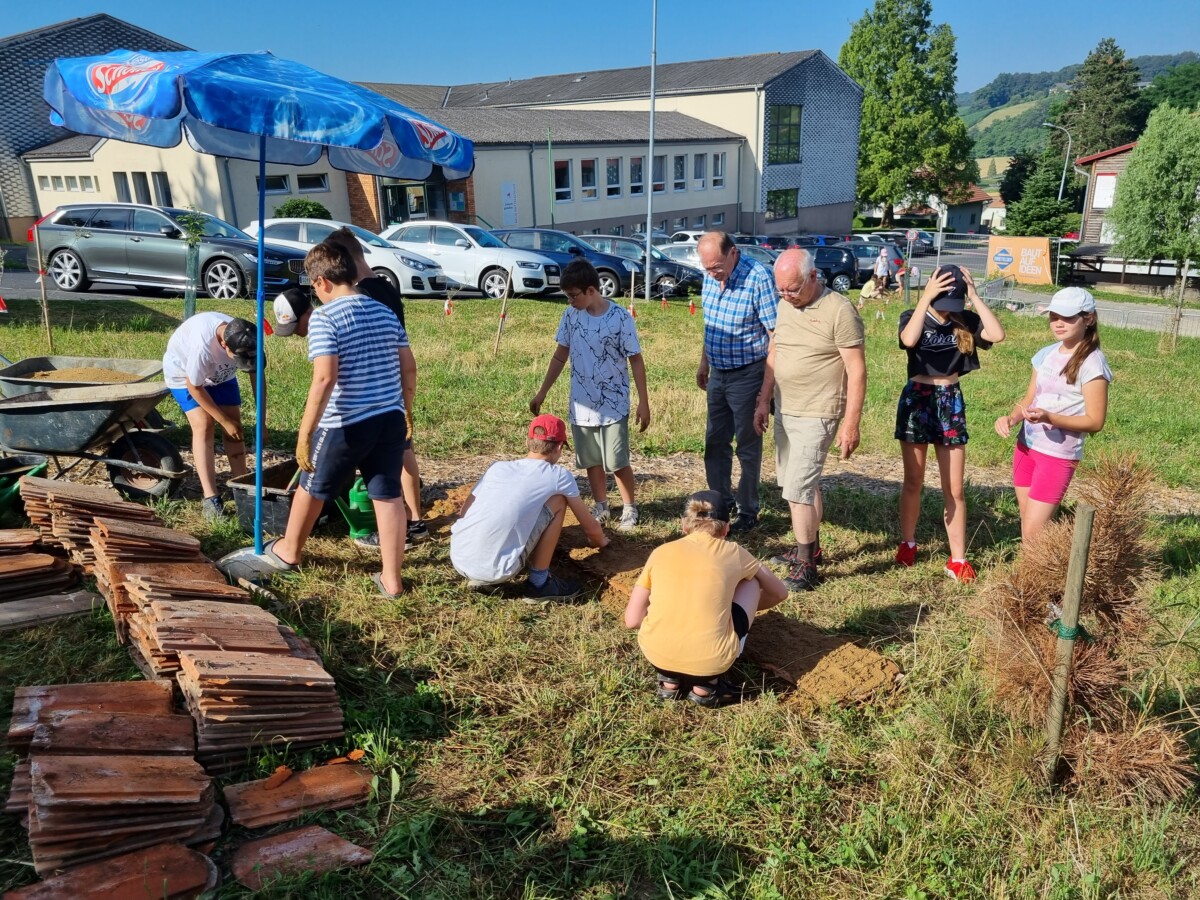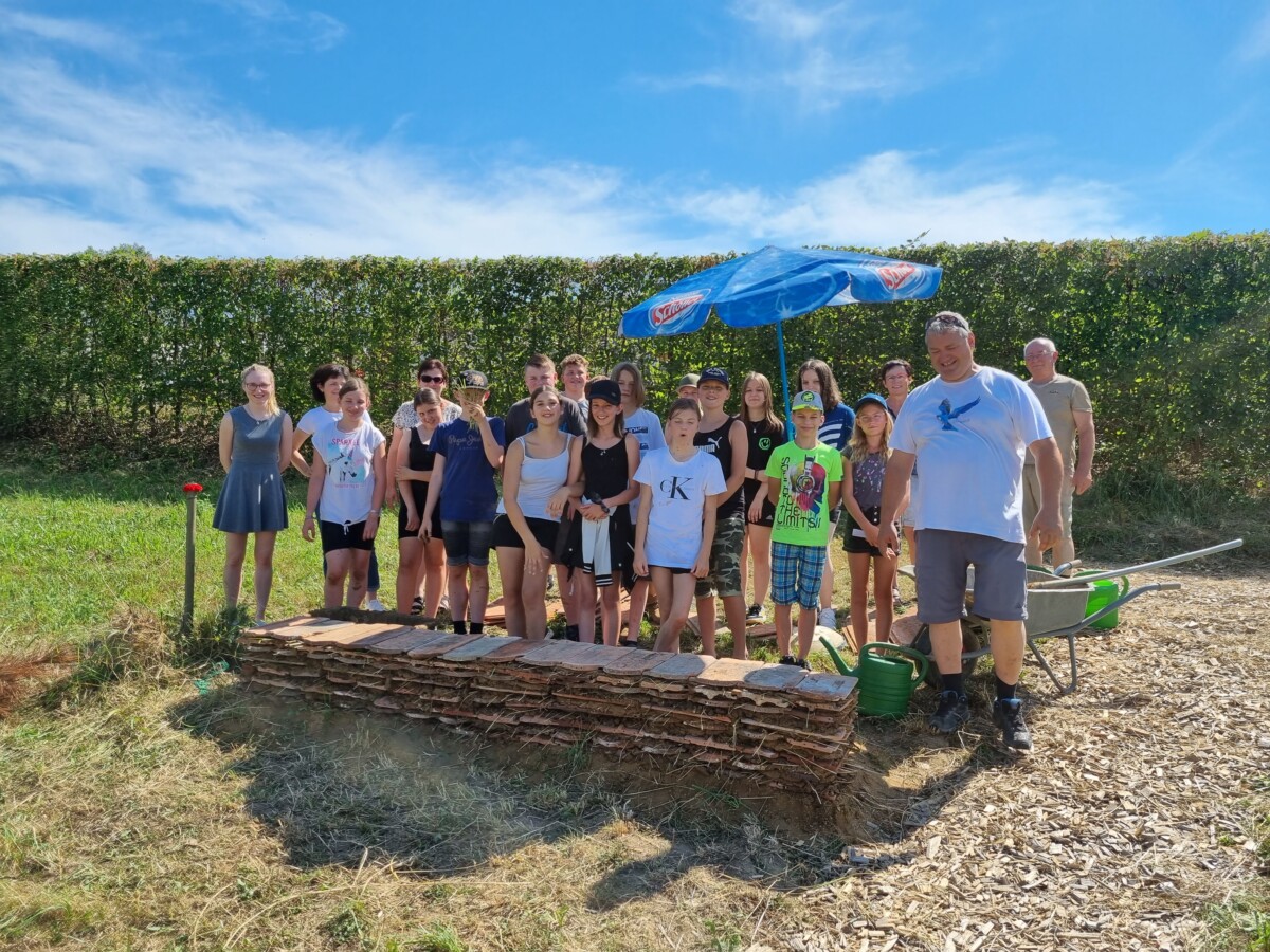 Zu den Hecken, Waldbereichen und Streuobstbäumen, zählt ein Honigbienenschaukasten, welcher von Altbürgermeister Alfred Niederl betreut wird und nun kam auch noch eine Nisthilfe für Mauerbienen aus alten Dachziegeln und Lehm (von der Fa. ProLehm gesponsert) dazu, welche die drei Klassen mit Mag. Bernd Wieser vom Verein Lebende Erde im Vulkanland errichteten.