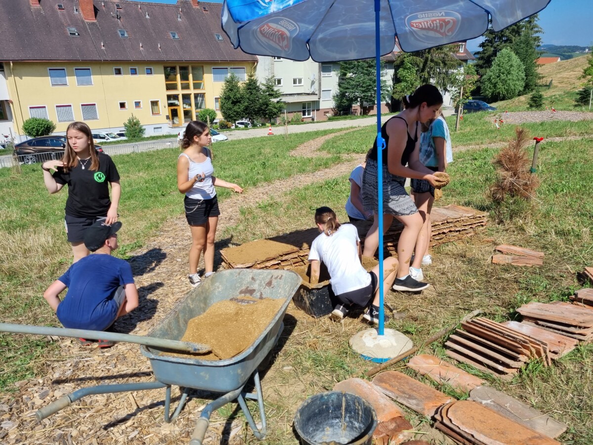 Alte Dachziegel liegen überall ungenutzt herum und warten auf ihre Wiederverwendung. Eine dekorative Möglichkeit ist eben dieses Gartenelement. Zusätzlich wurde der Lehm mit Grashalmen versehen, welche nach dem Abtrocknen unterschiedlich große Löcher im Lehm hinterlassen und für zahlreiche weitere, der über 700 Wildbienenarten Nistmöglichkeiten bieten.