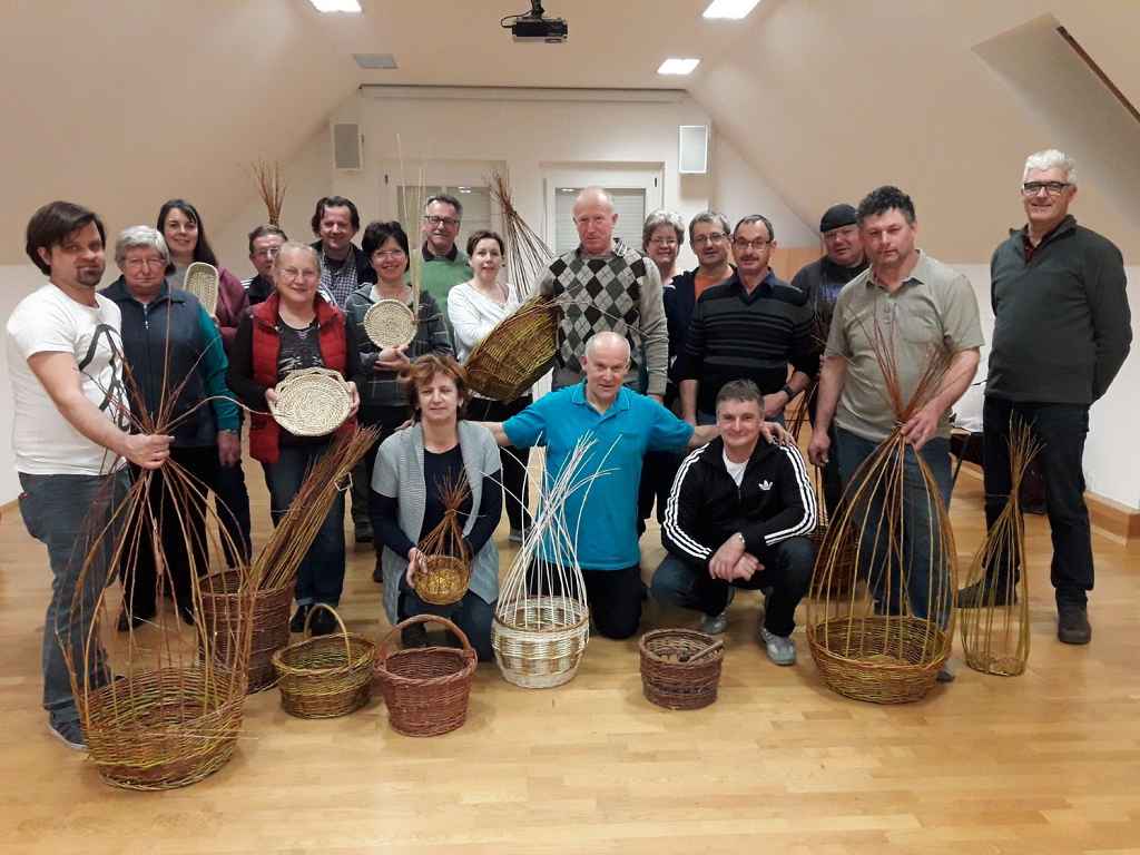 Jeweils am Freitag nach dem Festtag der Hl. Drei Könige treffen sich die Stainzer Korbflechter im Haus der Vulkane und freuen sich nach der langen Sommerpause über das Wiedersehen. „Weiden putzen und herrichten für das Flechten des Korbbodens sind die ersten Griffe, die Korbflechter lernen müssen“, so Leopold Riedrich, einer der Lehrmeister. Es schaut kompliziert aus, wenn für das Bodenkreuz die Weiden gespaltet und zusammen geschoben werden. Mit dünnen Weiden beginnt dann das Flechten. „Ganz so schwer kann es nicht sein, wenn mein 12-jähriger Sohn Florian es innerhalb weniger Tage erlernt hat“, macht Christian Lackner aus Radochen den Anfängerinnen Mut. Und stolz zeigen diese am Ende des ersten Abends ihren fertigen Boden und freuen sich schon, wenn sie beim nächsten Mal die Weiden für den Aufbau der Seitenwand in diesen einstecken werden.