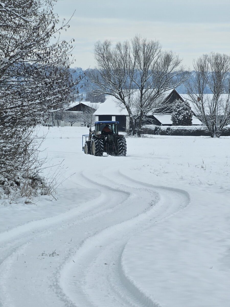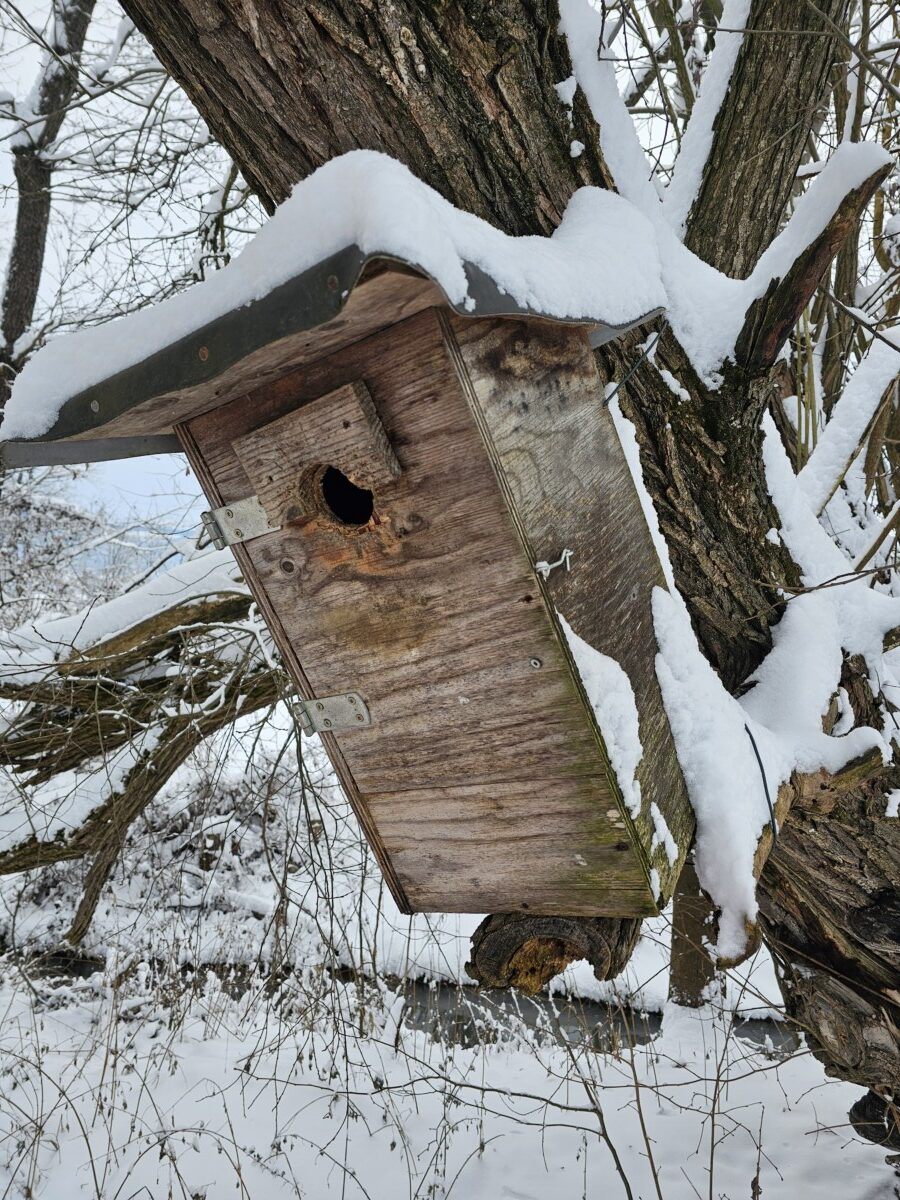 Wenn der Boden gefroren bleibt, dann ist es Zeit die Blauracken-Nistkästen den Inhalt aus 2025 zu sichten und zu reinigen. Immerhin liegen 85 Nistkästen über einige Gemeinden verstreut in den Talböden. Mit dem Frontlader hebt uns Curd Ranz zu den Kästen auf 5-6 m empor.
