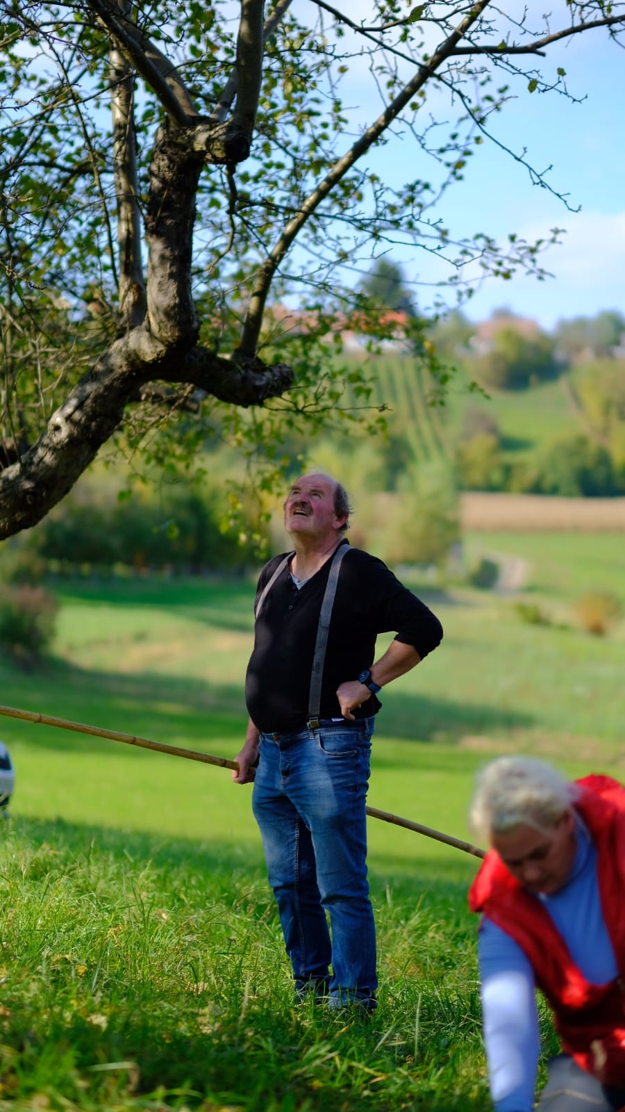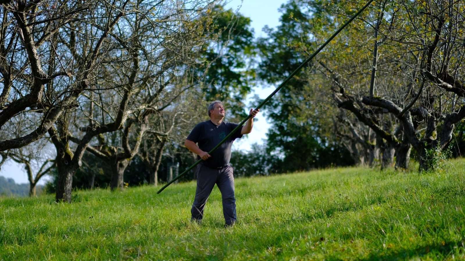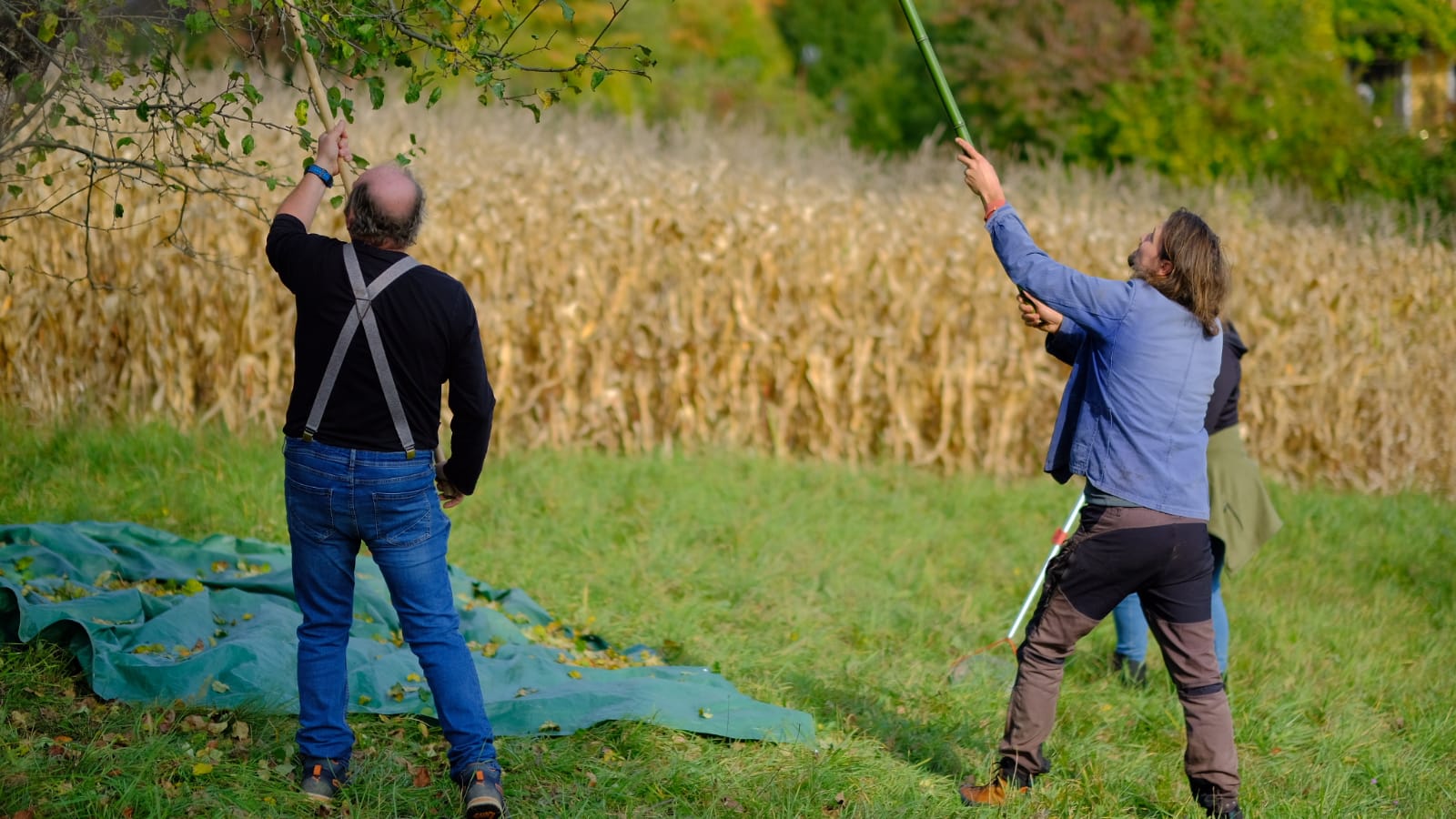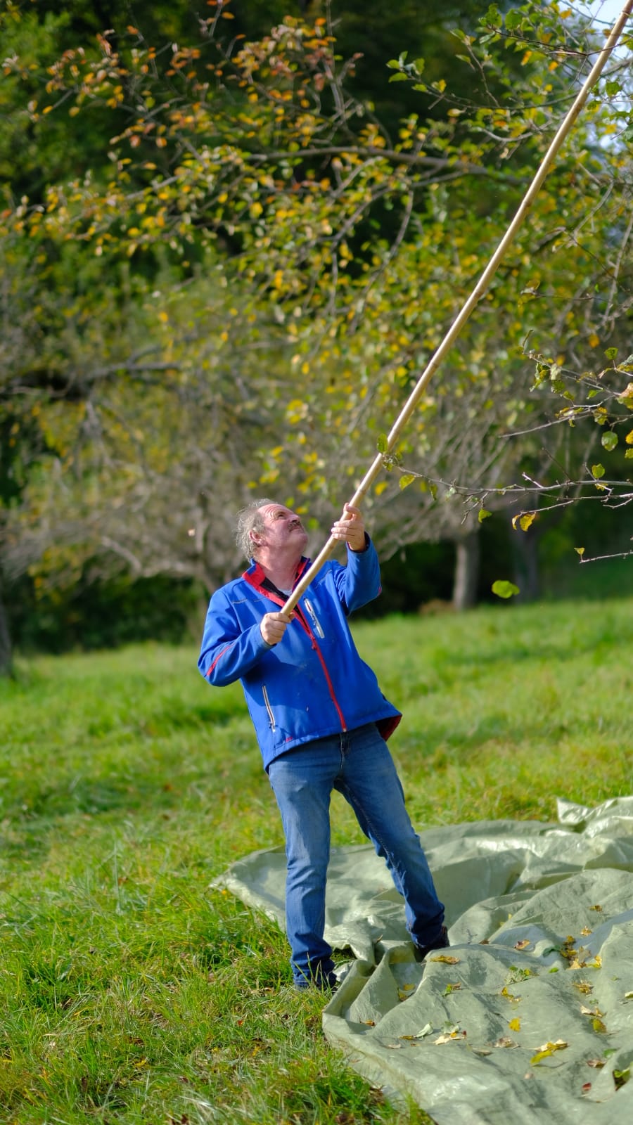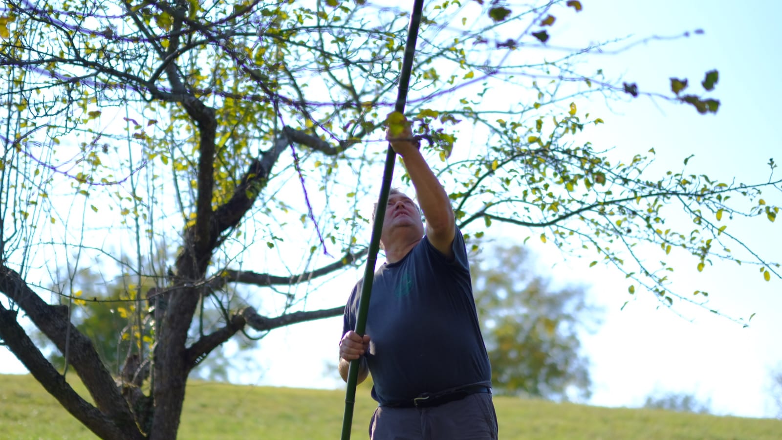 Mit Bambusstangen im Astwerk der Obstbäume anhackeln