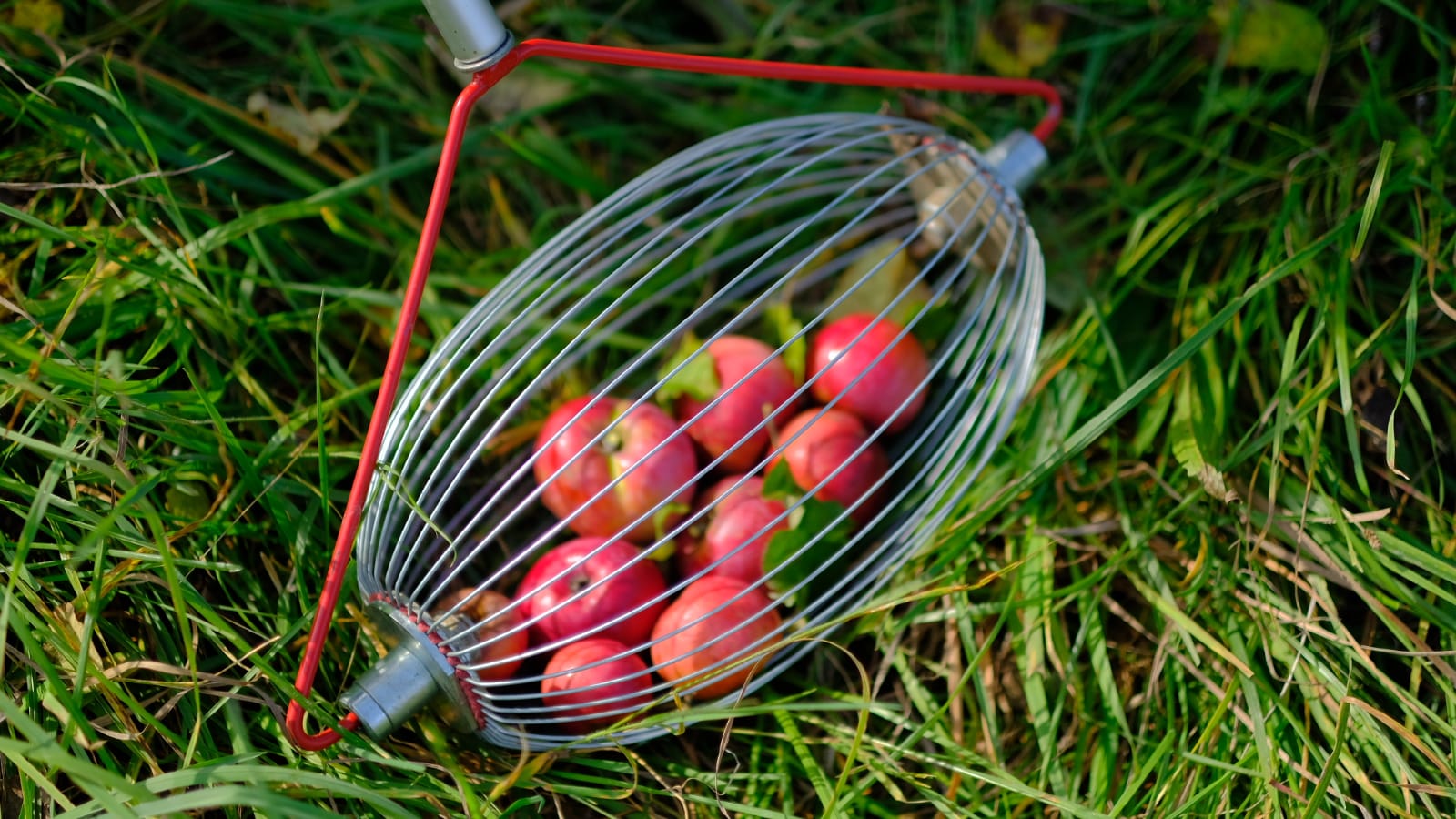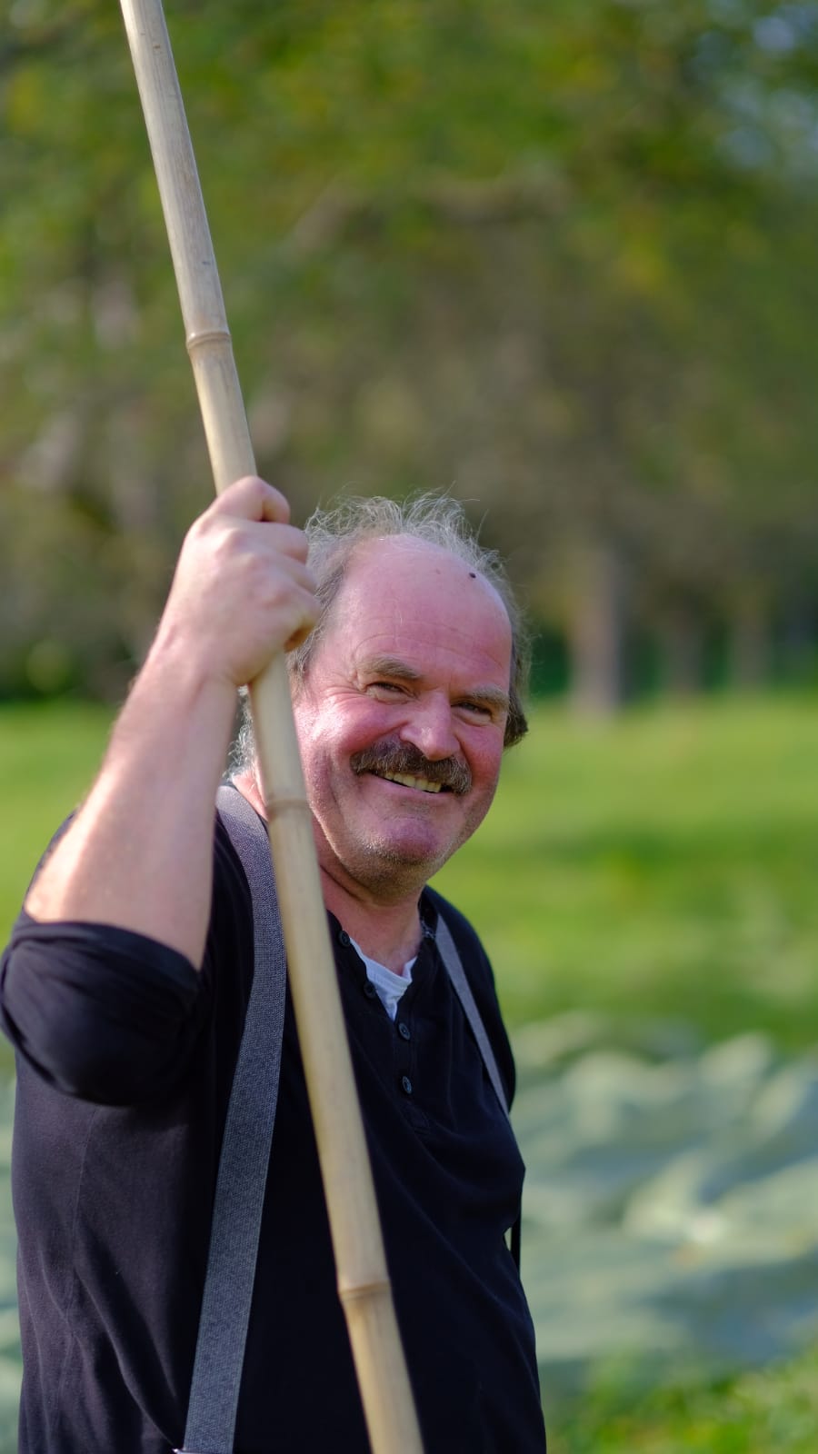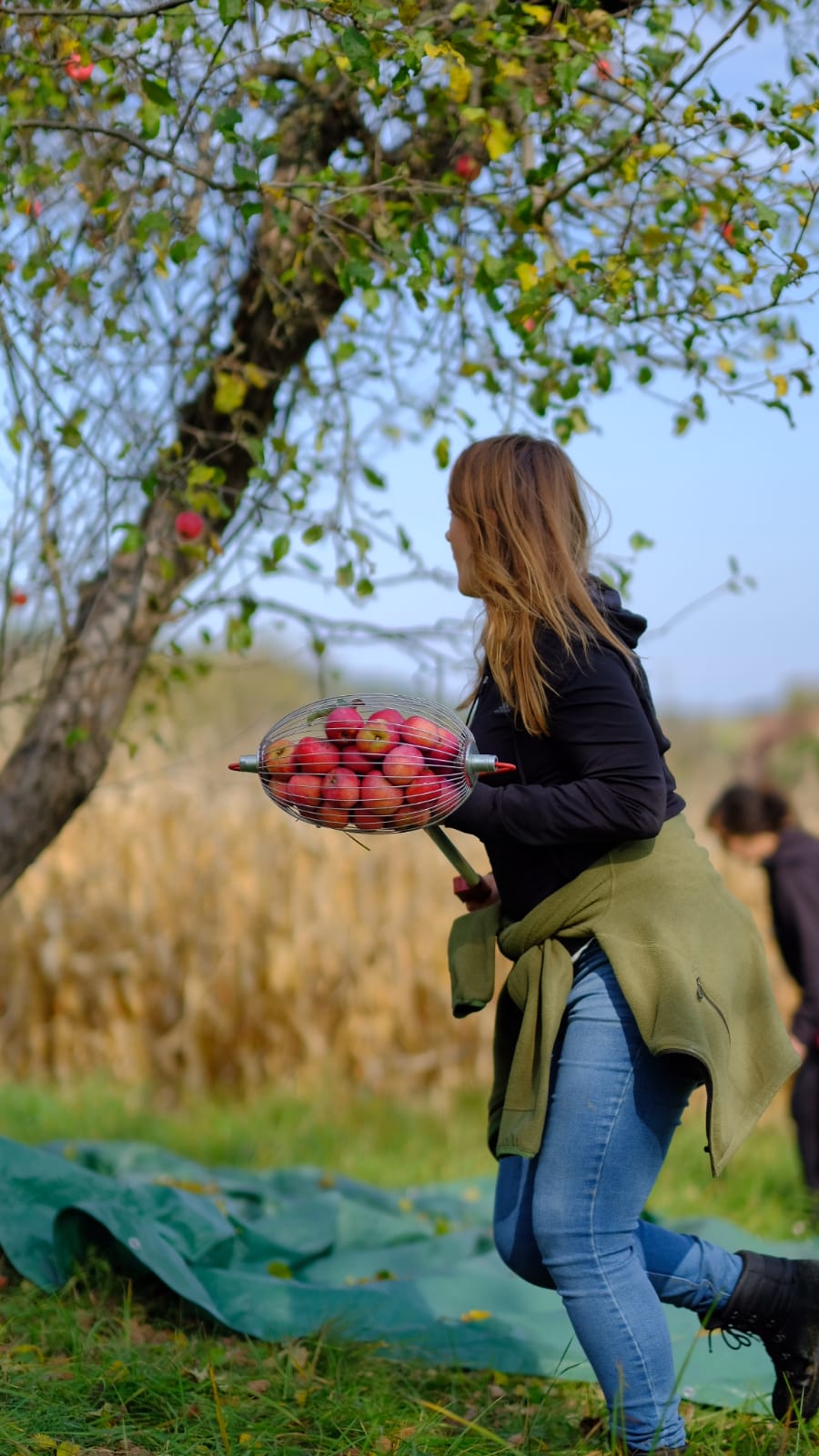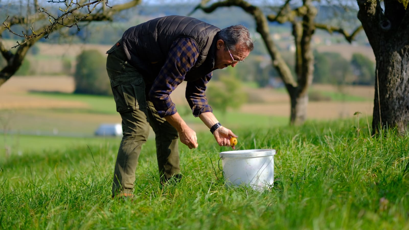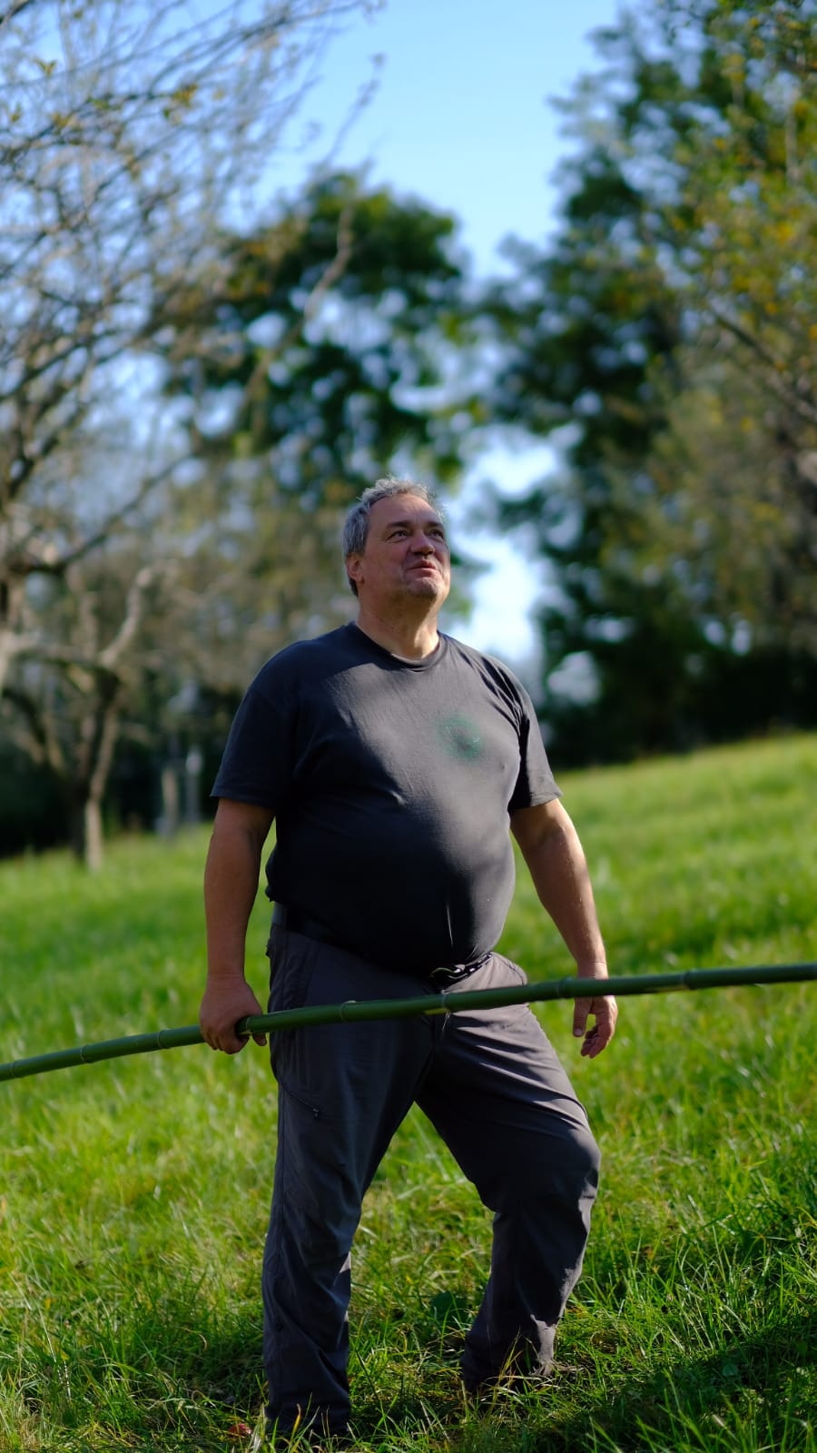 Mit Bambusstangen im Astwerk der Obstbäume anhackeln