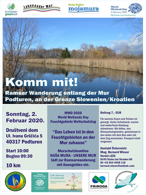 Bei Sonnenschein und warmen 15 °Celsius fand die diesjährige Ramsar Wanderung in dem kleinen Grenzort Podturen in Kroatien an der Mur ihren Ausgangspunkt. Über 700 Wanderer haben die Organisatoren sichtlich überrascht. Auch aus der Steiermark kamen fast 100 Teilnehmer. Schon während der Busfahrt erklärten Naturpark Direktorin Stanka Dessnik und LEiV-Geschäftsführer Mag. Bernard Wieser vom Internationalen Murschutzkomitee, warum dieser Tag so wichtig für uns Menschen ist. Der Klimawandel hängt weltweit auch mit dem Absinken der Oberflächen-nahen Grundwässer ab und wir haben in den letzten 150 Jahren diese Feuchtflächen weltweit um 85 % reduziert.
