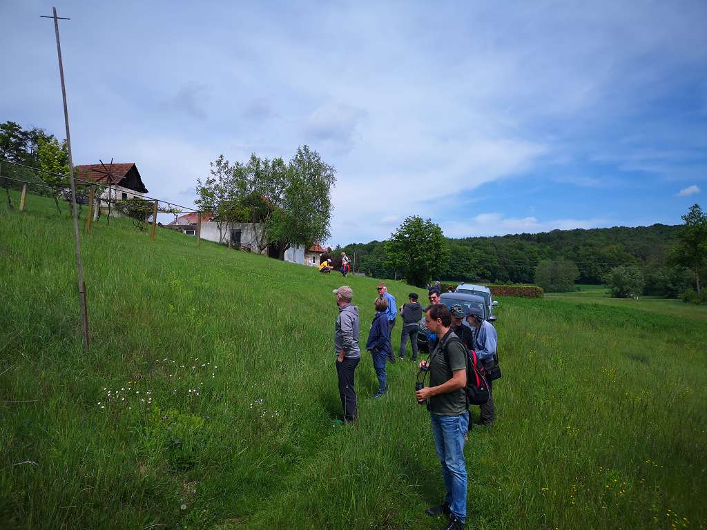 Der Nachmittag führte uns zuerst zu den Feuchtwiesen von Wieden und Kronnersdorf. Auch dort gibt es immer wieder Blauracken zu beobachten. Diesmal mussten wir mit den Feuchtwiesen-Orchideen und allerlei seltenen Pflanzenarten des vom Aussterben betroffenen Biotoptyps im Gebiet Vorlieb nehmen. Das Wetter hat gehalten und deshalb ging es nochmals zurück nach Karbach, wo wir dann endlich auch gleich zwei Blauracken beim Liebesgeflüsster beobachten konnten. Todgesagte leben eben länger und das gilt auch für unsere Stars.