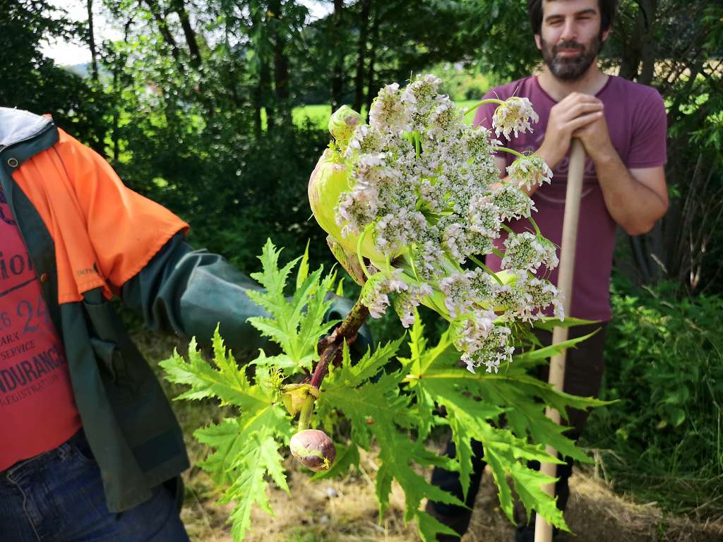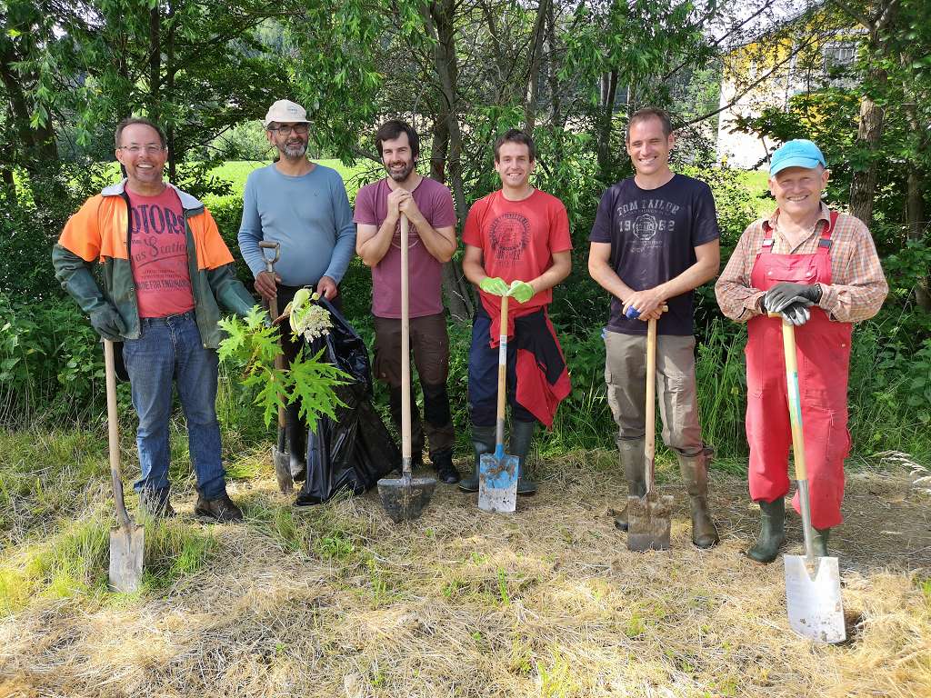 Obwohl seit einigen Jahren alles unternommen wird, um diese Pflanze in den Griff zu bekommen, verbreitet sie sich über unsere Flüsse nach Osten. Kaum hat die Berg& Naturwacht ein Nest bekämpft, ist schon das nächste da. Wir haben gewußt, dass es so kommen wird. Im Frühjahr sieht man die Jungpflanzen nicht immer und schon sind im Sommer die ersten Grundblätter gebildet. Im hohen Bestand des Drüsigen Springkrautes, das inzwischen die Bachsäume bestimmt, sind die Grundblätter nicht mehr auszumachen. Erst im nächsten Jahr finden wir dann wieder Pflanzen an völlig neuen Standorten. Durch das Transportieren von Erdmaterial, oft über die Bauhöfe verursacht, kommen die Neophyten sogar weit vom Gewässer entfernt auf. Noch haben wir nicht verloren, aber es gibt immer mehr Verletzungen durch die Pflanzen. Die Bevölkerung muss auch wachsamer werden. Der Blühbeginn des Riesenbärenklau lag heuer am 9. Juni. So der Bericht von Bezirksleiter Mag. Bernard Wieser.
