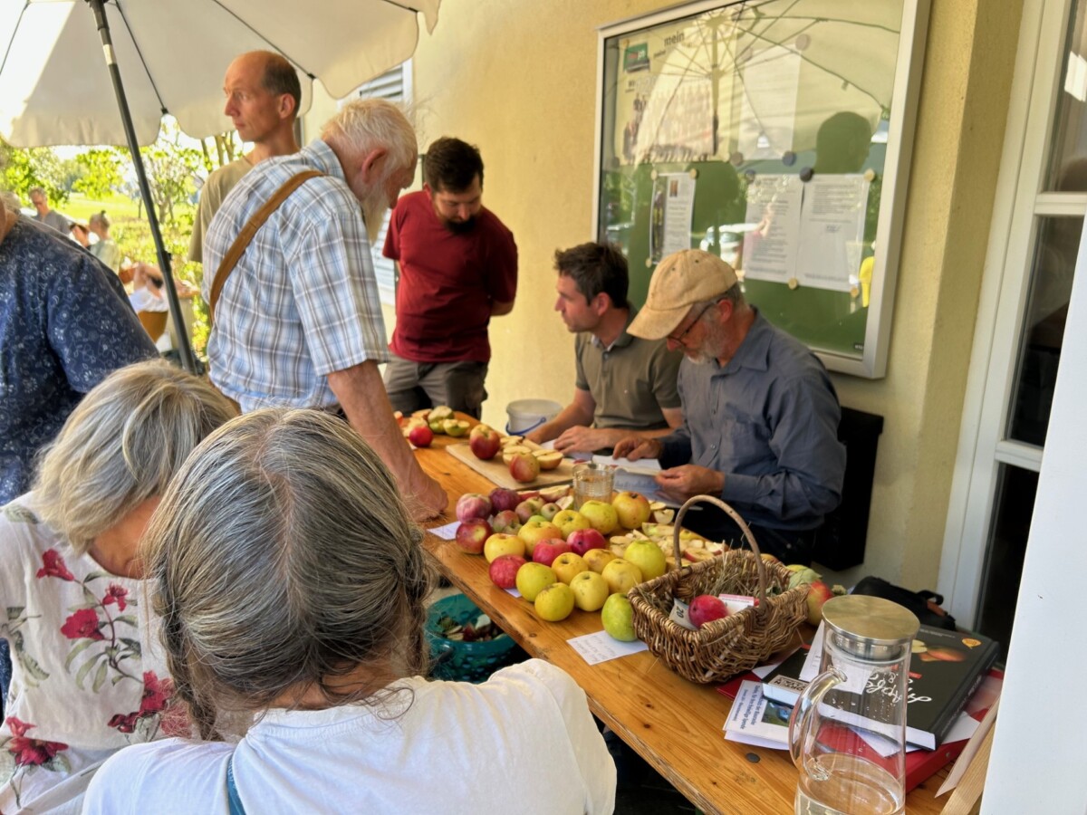2 Pomologen, Dr. Michael Suanjak und DI Stefan Tschiggerl gaben einem breiten Publikum ihr Wissen in Sachen Streuobst-Sorten und Streuobst-Anbau weiter. Die Sortenbestimmung lief von 10 bis 15 Uhr ohne Unterbrechung aufgrund der mitgebrachten Früchte der Besucher. Ein Führung durch die Welt der Obstsorten (ca. 150 Sorten) fand unter großem Interesse statt.